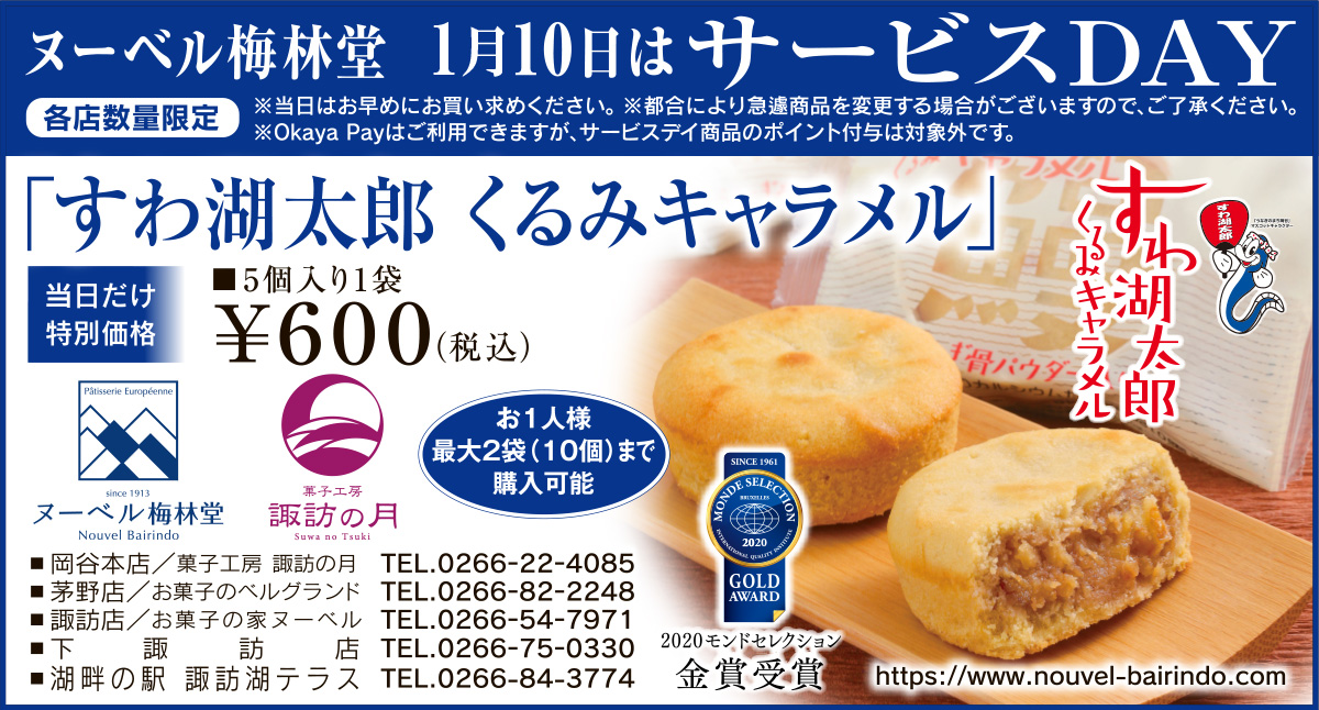 毎月10日は、ヌーベル梅林堂のサービスデーです。岡谷本店/茅野店/諏訪店/下諏訪店/湖畔の駅 諏訪湖テラスにて、当日店頭のみの特別価格にてご提供させていただきます。
